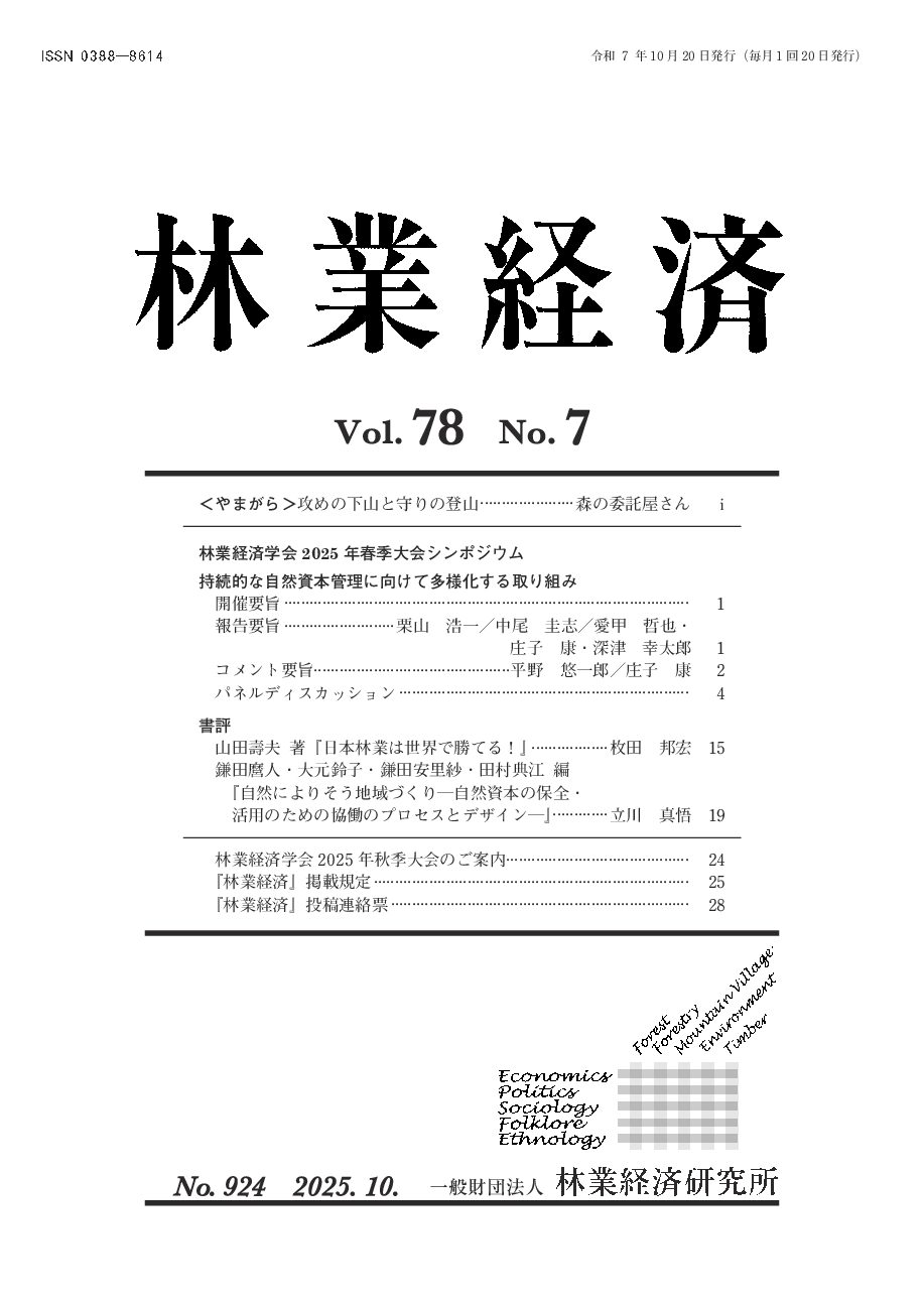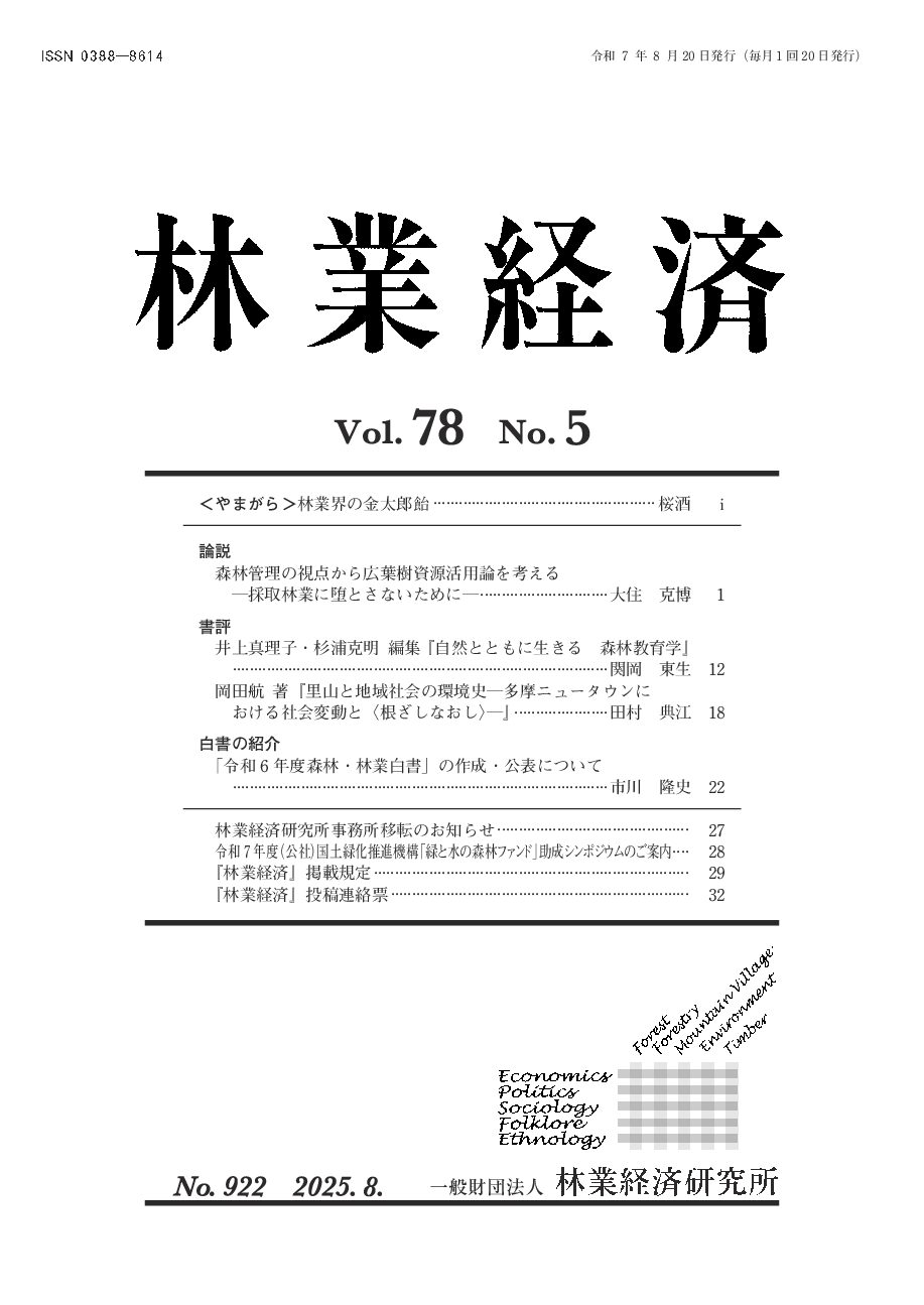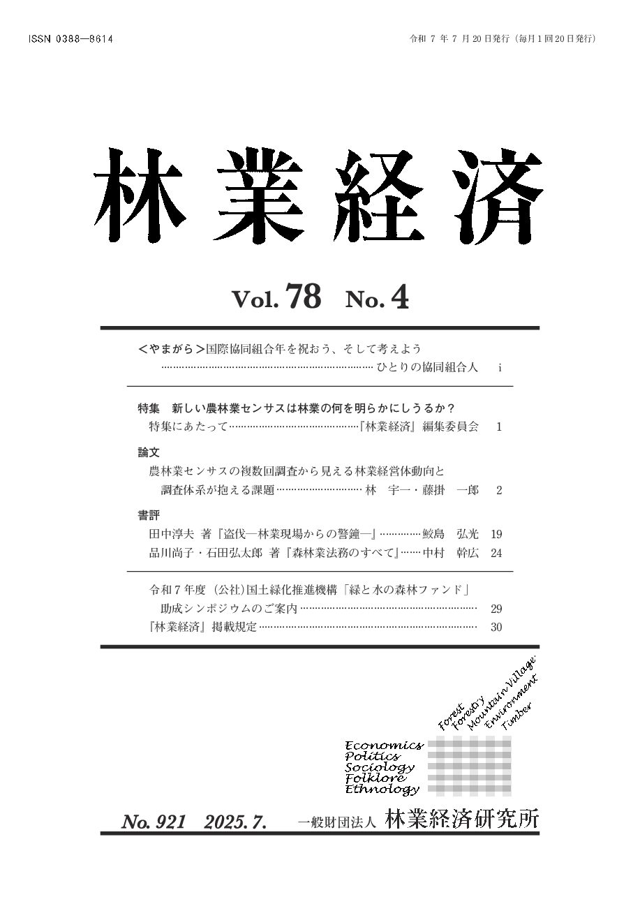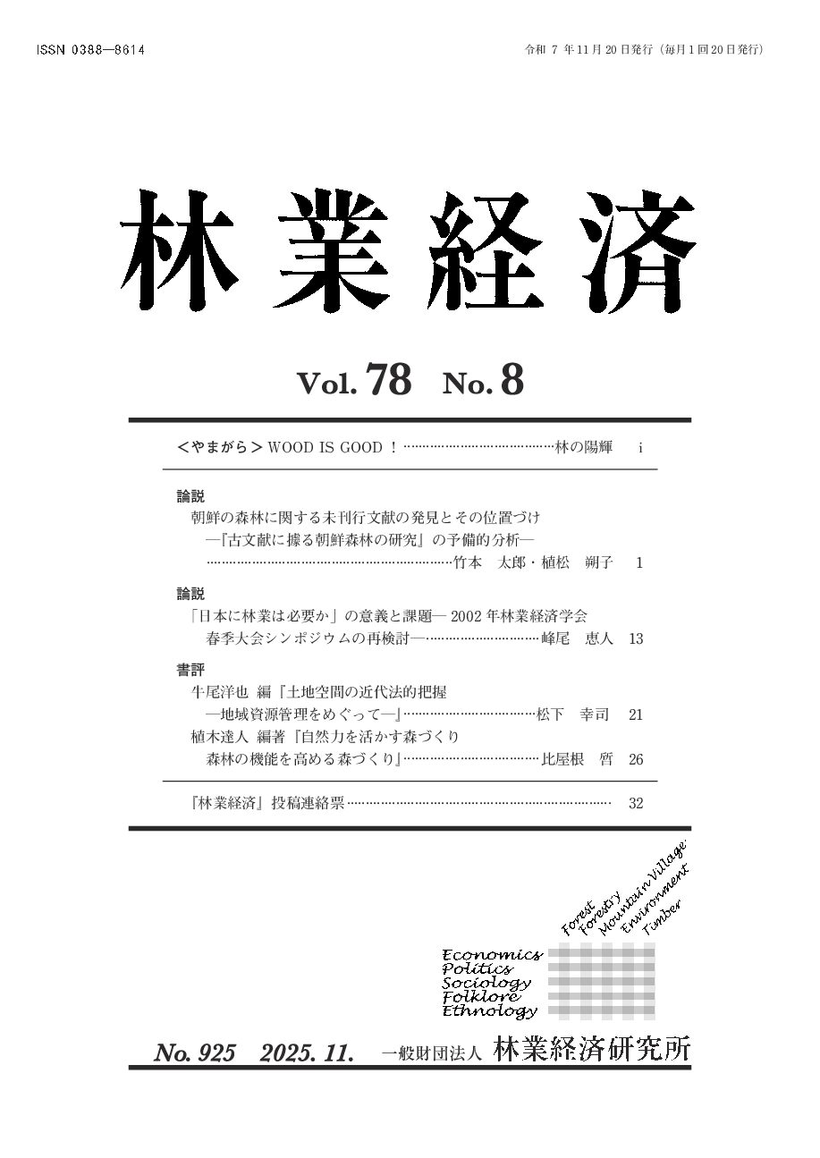 月刊誌『林業経済』は、昭和23(1948)年創刊の学術専門誌です。森林・林業・山村問題から、環境問題、市民運動や地域振興にいたる多彩な内容を、論文、研究ノート、書評、各種シンポジウム記録等で社会に向けて発信しています。