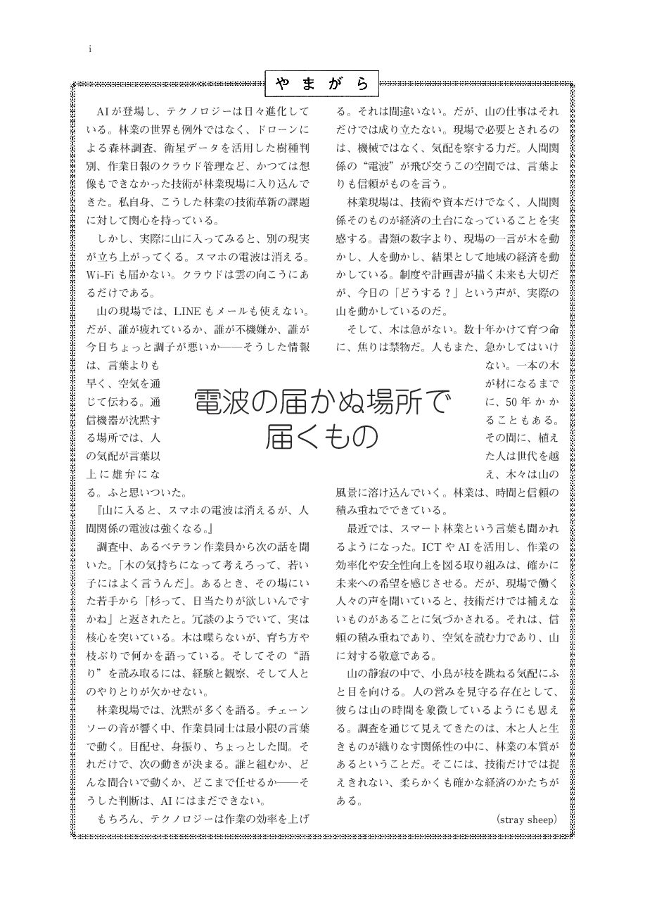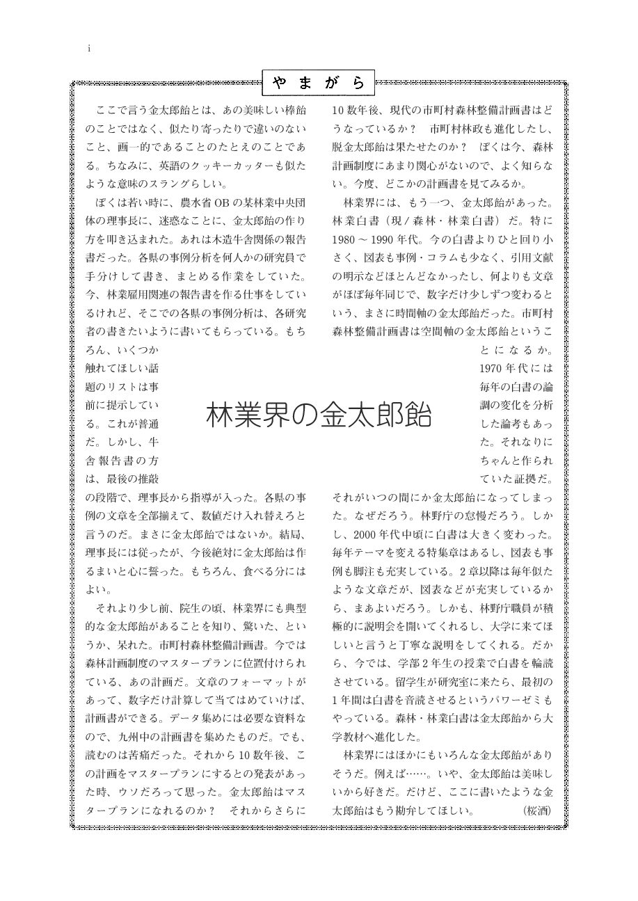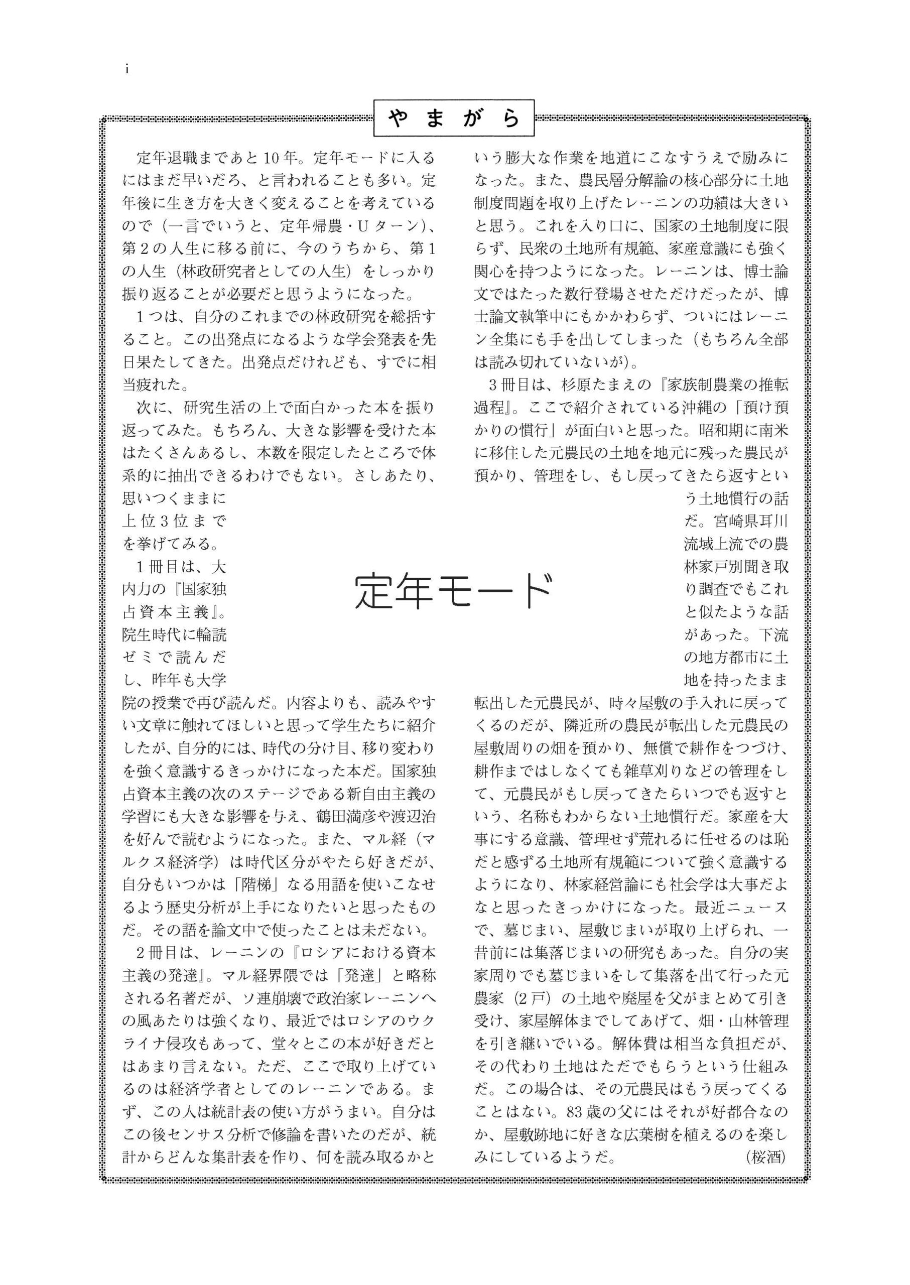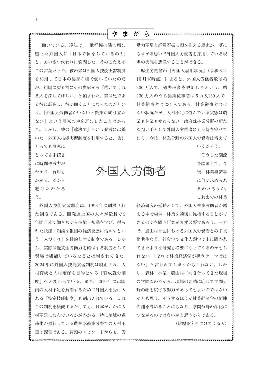 「やまがら」は、『林業経済』誌創刊直後から毎号掲載されているエッセイ・コラムです。執筆は、当研究所編集委員会の編集委員、毎号順番に匿名で担当します。順番の編集委員が依頼した委員以外の個人が担当する場合もあります。内容は、森林・林業・山村関係についての、その時々の時事的な話題を対象としたものが多いですが、特に限定はしていません。それぞれの編集委員の個性に溢れた文章をお楽しみください。