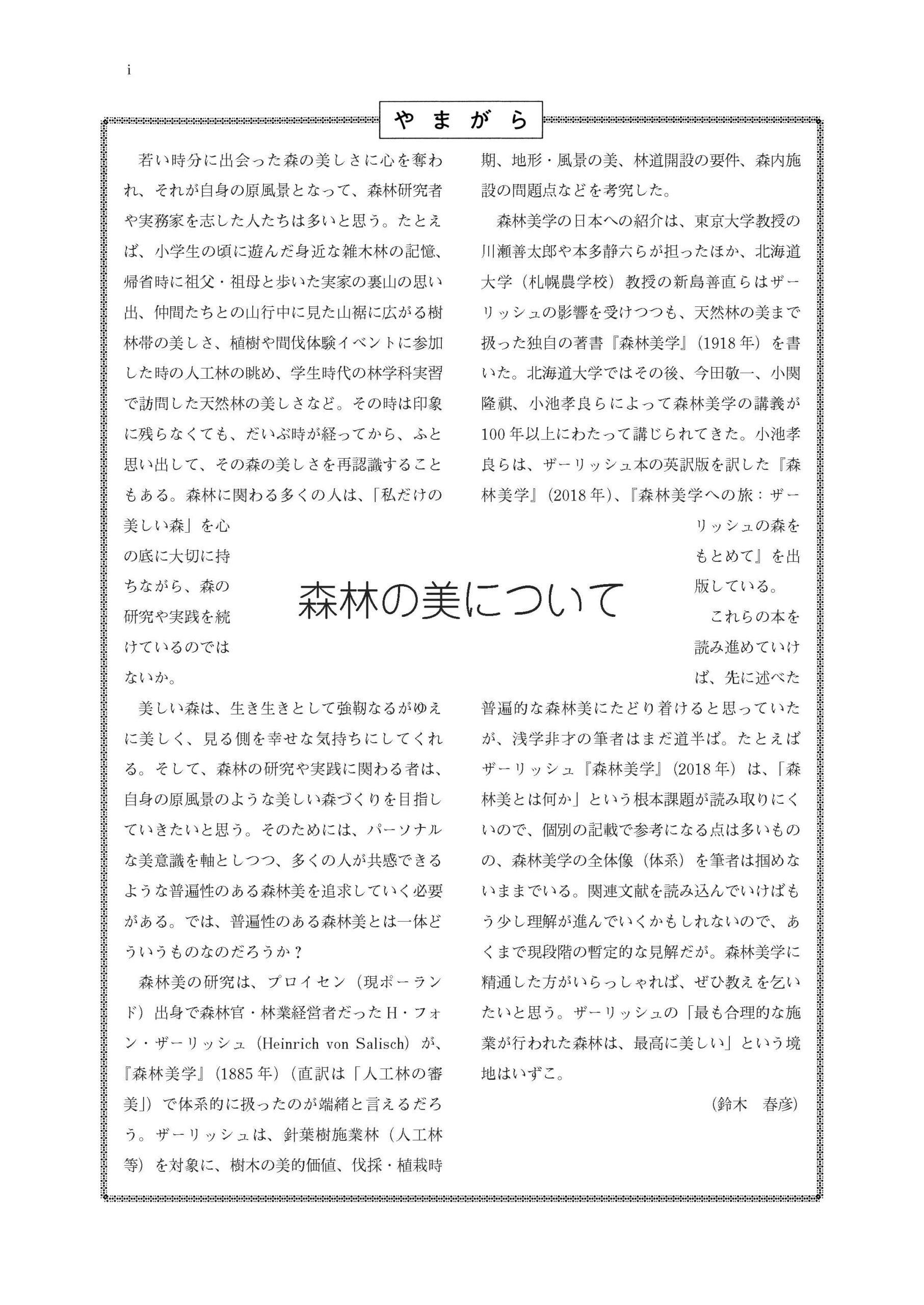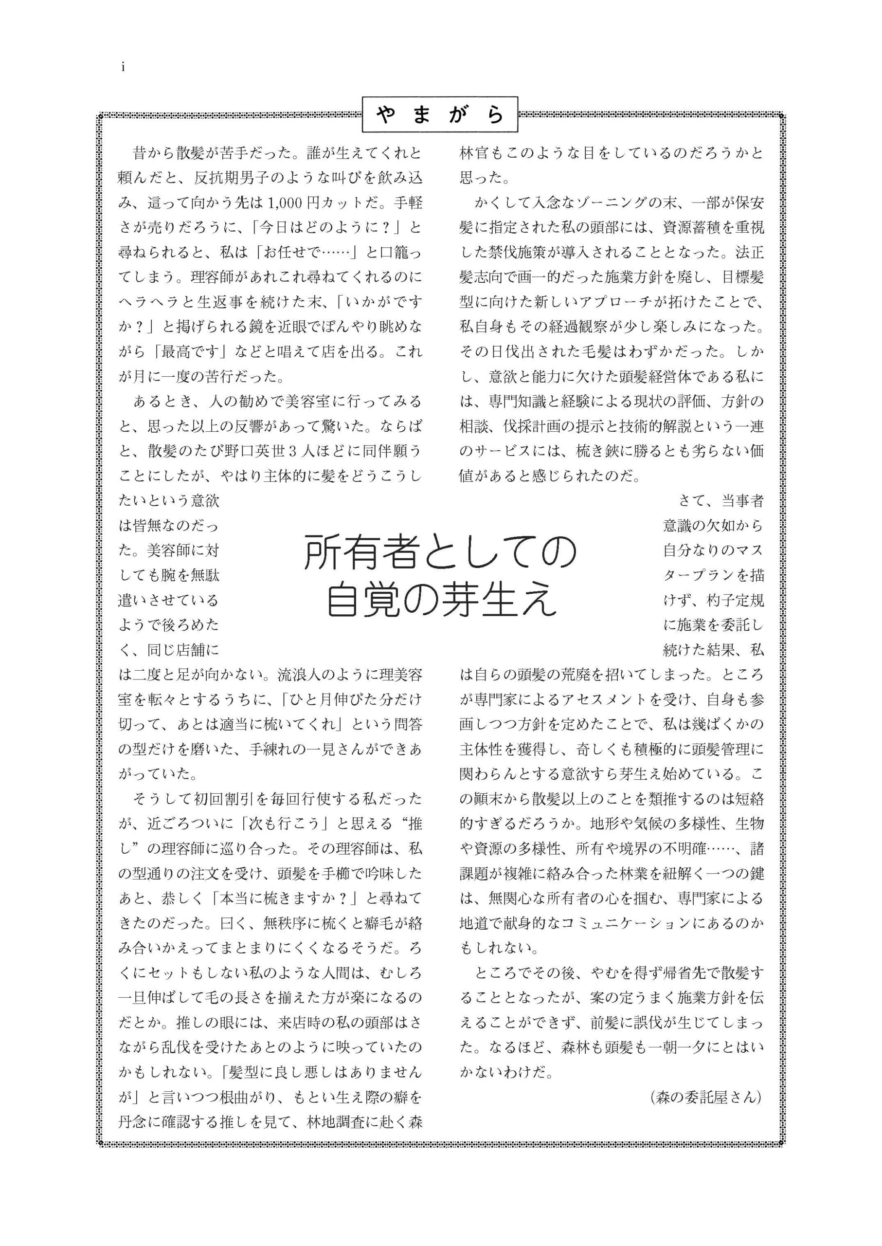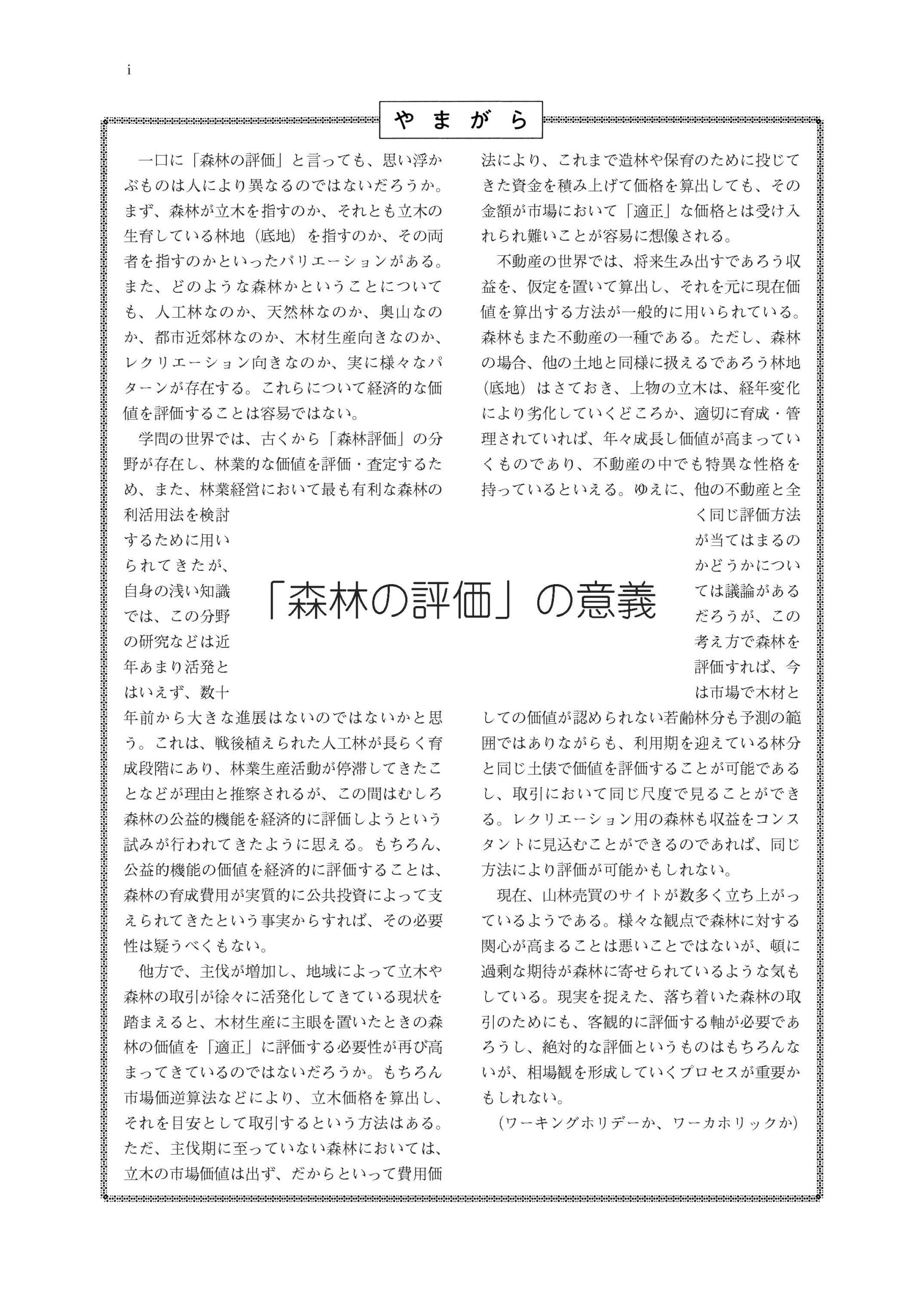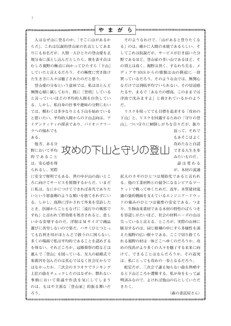 「やまがら」は、『林業経済』誌創刊直後から毎号掲載されているエッセイ・コラムです。執筆は、当研究所編集委員会の編集委員、毎号順番に匿名で担当します。順番の編集委員が依頼した委員以外の個人が担当する場合もあります。内容は、森林・林業・山村関係についての、その時々の時事的な話題を対象としたものが多いですが、特に限定はしていません。それぞれの編集委員の個性に溢れた文章をお楽しみください。