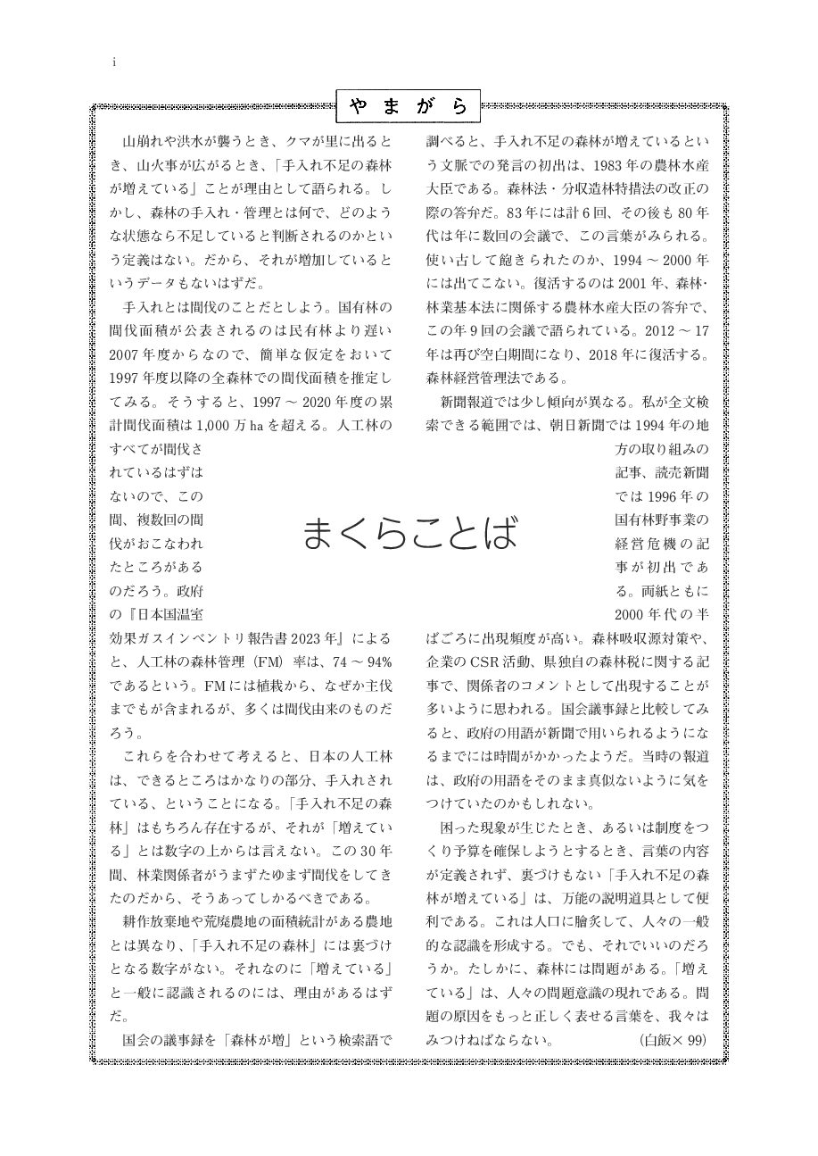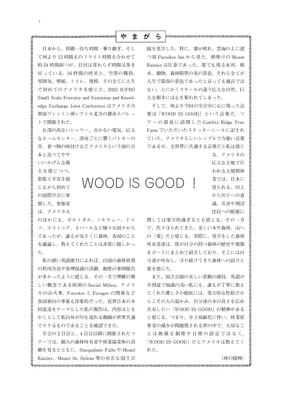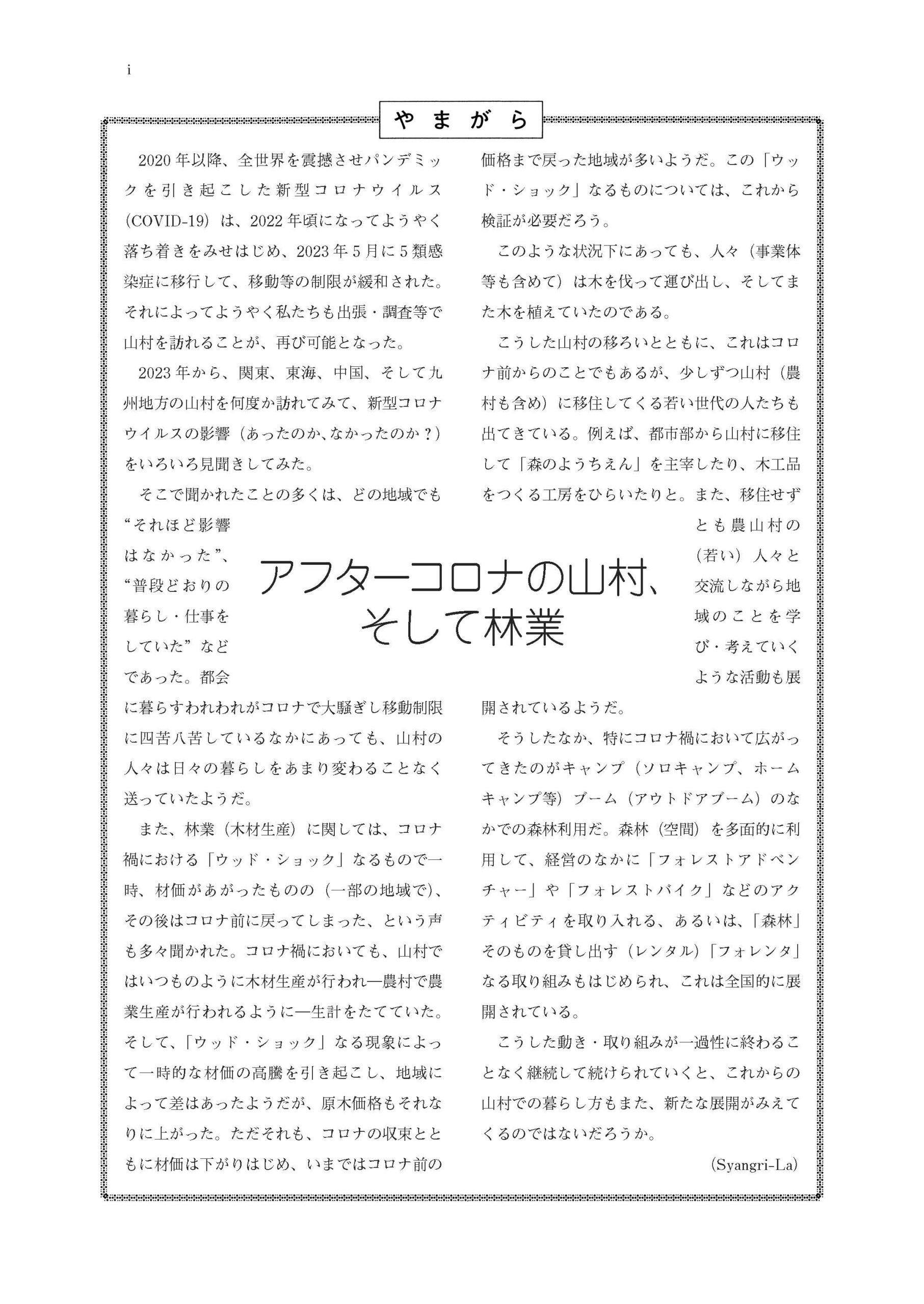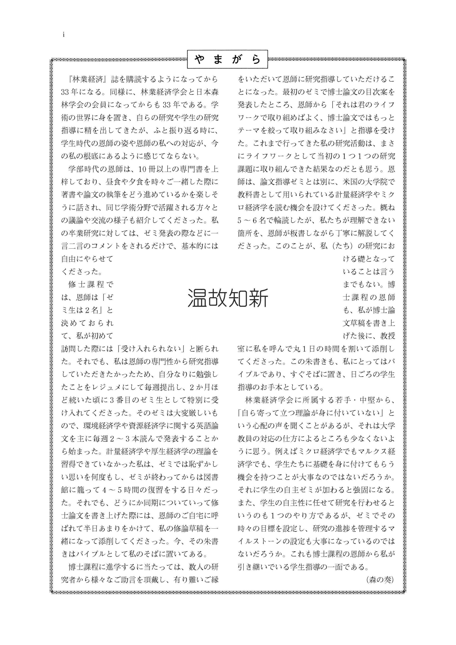 「やまがら」は、『林業経済』誌創刊直後から毎号掲載されているエッセイ・コラムです。執筆は、当研究所編集委員会の編集委員、毎号順番に匿名で担当します。順番の編集委員が依頼した委員以外の個人が担当する場合もあります。内容は、森林・林業・山村関係についての、その時々の時事的な話題を対象としたものが多いですが、特に限定はしていません。それぞれの編集委員の個性に溢れた文章をお楽しみください。