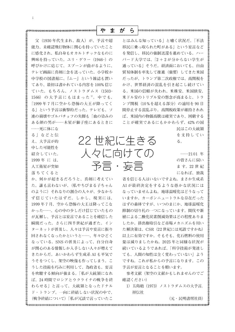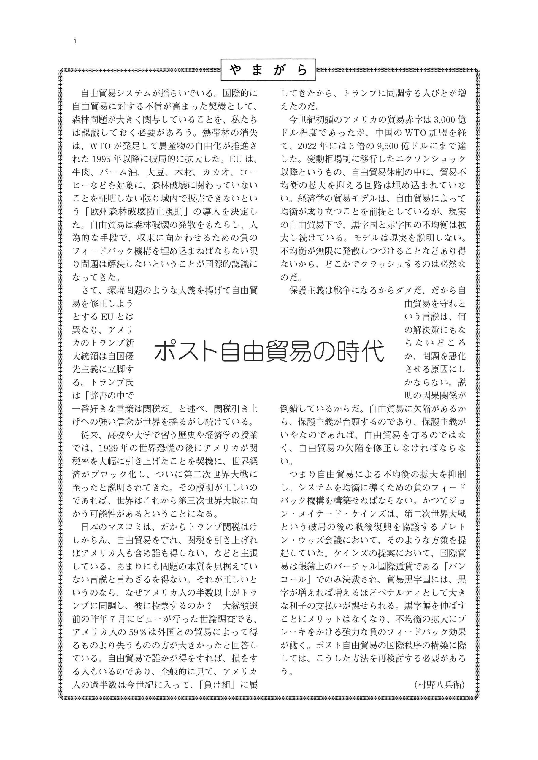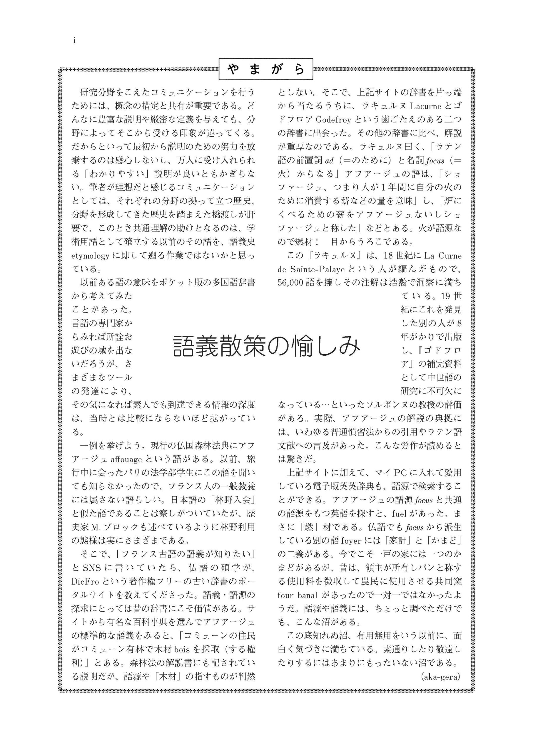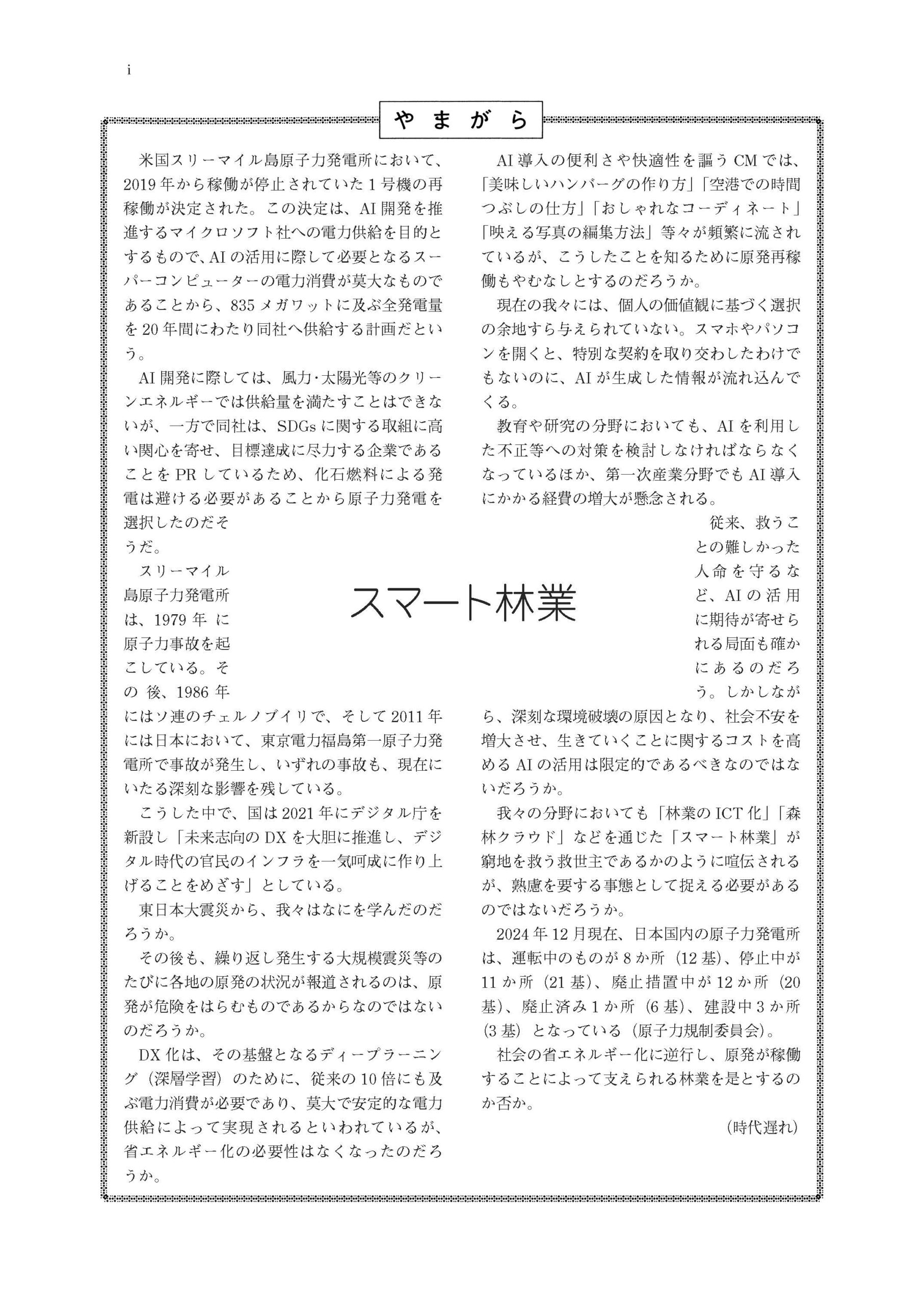 「やまがら」は、『林業経済』誌創刊直後から毎号掲載されているエッセイ・コラムです。執筆は、当研究所編集委員会の編集委員、毎号順番に匿名で担当します。順番の編集委員が依頼した委員以外の個人が担当する場合もあります。内容は、森林・林業・山村関係についての、その時々の時事的な話題を対象としたものが多いですが、特に限定はしていません。それぞれの編集委員の個性に溢れた文章をお楽しみください。